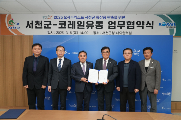 서천군은 지난 6일 서천군청 대외협력실에서 김기웅 서천군수와 코레일유통 다원사업본부장 등 관계자 8명이 참석한 가운데 ‘2025 오사카엑스포 팝업스토어 운영에 관한 업무협약(MOU)’을 공식적으로 체결했다.