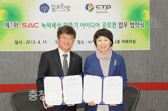 충남테크노파크(원장 장원철)는 아산시 인주면 걸매리에 위치한 재단법인 ‘SAC 꿈과 희망(이시장 신현숙)’과 친환경 아이디어 공모전 공동 운영에 관한 업무협약을 체결했다고 11일 밝혔다.
