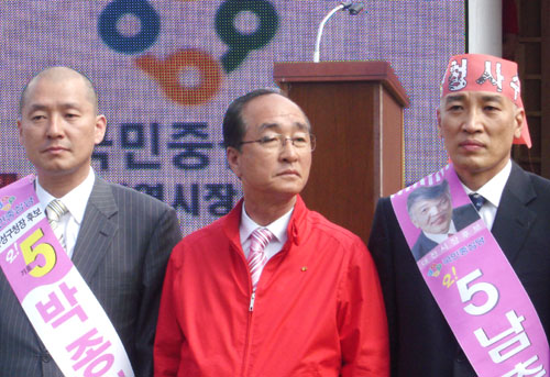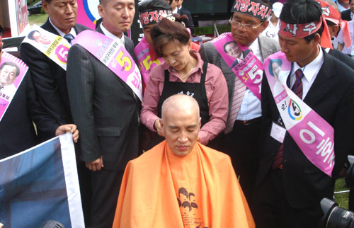 이번 지방선거에 당의 사활을 걸고있는 국민중심당은 남충희 시장후보를 비롯한 기초단체장 후보들까지 삭발대열에 가세하며 지역 정서에 호소했다.