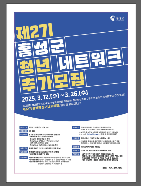 군은 지난해 6월 위촉된 제2기 청년네트워크 위원의 잔여임기(26년 6월)까지 활동할 수 있는 위원을 추가모집 한다는 계획이다. 모집인원은 6명 이내이며, 홍성군에서 거주하거나 활동하는 18세 이상 49세 이하 청년이면 누구나 신청 가능하다. 신청 서류는 홍성군청 홈페이지 공고란을 참고하여 홍성군청 경제정책과로 방문 및 e-mail로 접수하면 된다.