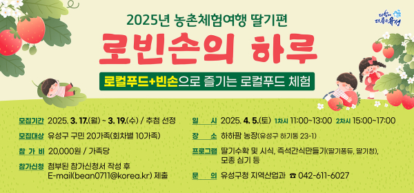 올해는 총 20가족을 모집하며 4월 5일 오전·오후 2회에 걸쳐 진행된다. 회차별로 10가족이 관내 딸기농장에서 딸기 수확 체험과 딸기를 활용한 간식 만들기 등 다양한 체험을 하게 된다.