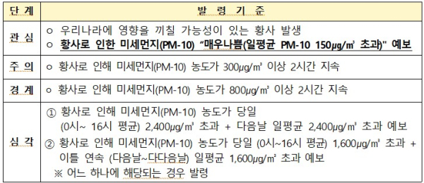 국민행동 요령에 따르면, 관심 단계 발령 시 가정에서는 예·경보 상황을 수시로 확인하며 황사가 실내로 들어오지 않도록 창문 점검 및 밀폐 조치를 취해야 한다.