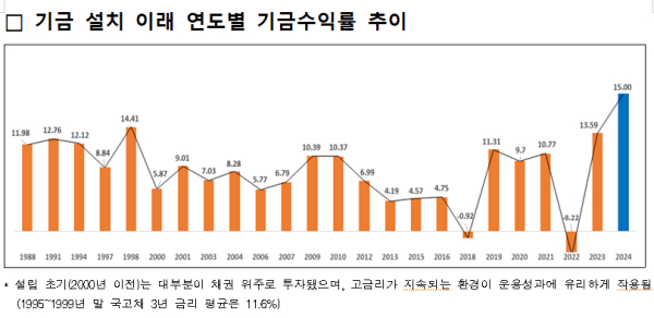 이에 따라 기금 설치 이후 수익률은 연평균 6.82%를 기록했으며, 누적 운용수익금은 총 738조 원으로 집계됐다.