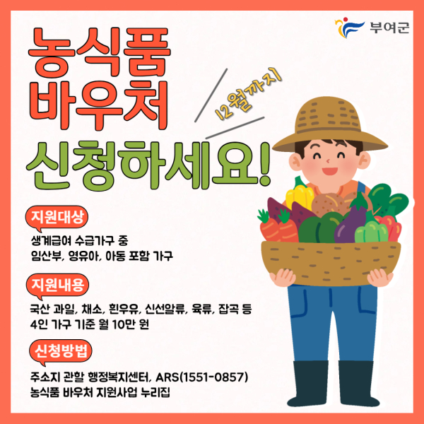[충청뉴스 부여 = 조홍기 기자] 부여군(군수 박정현)은 지역 내 취약계층의 건강한 식생활을 돕기 위해 ‘농식품 바우처 지원사업’에 대해 신청받는다.