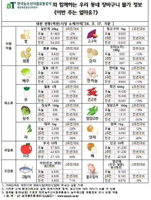 [충청뉴스 최형순 기자] 한국농수산식품유통공사 대전세종충남지역본부(aT, 지역본부장 장서경)는 대전 지역 농수산물 소비자들의 합리적인 구매를 지원하고 전통시장 활성화를 위해 '이번 주는 얼마유?'(3월 넷째 주) 장바구니 물가정보를 발표했다.