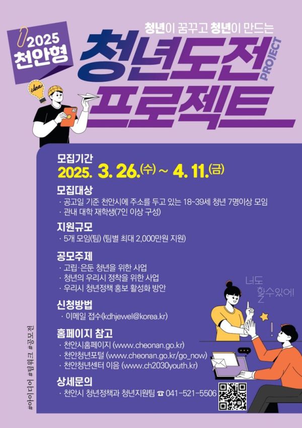 [충청뉴스 박동혁 기자] 충남 천안시는 ‘2025년 천안형 청년 도전 프로젝트’ 참여자를 모집한다고 27일 밝혔다.