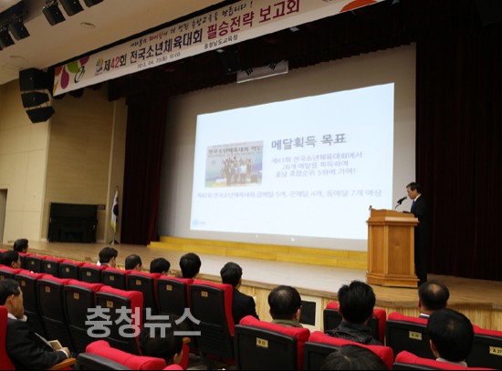 충남교육청(교육감 권한대행 부교육감 전찬환)은 23일 오후 제42회 전국소년체전을 32일 앞두고 본청 대강당에서 14개 지역교육지원청 교육장, 전국소년체전 출전선수 소속 학교장과 지도교사, 체육담당 장학사, 체육업무 담당자 등 350여명이 참석한 가운데 '제42회 전국소년체육대회 필승전략 보고회'를 개최했다.