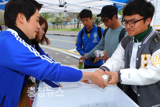 무료 주먹밥과 음료로 소박하지만 든든한 응원