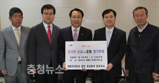 대한지적공사 대전·충남본부 동부지사(지사장 정만수)는 24일 한현택 동구청장을 찾아 지사장 및 직원들의 천사의 손길 정기 후원 신청서(월 200구좌, 연2,400,000원 상당)를 전달했다.