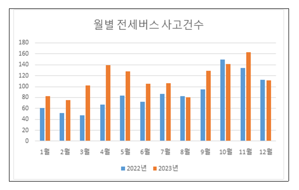 한국도로교통공단 대전·세종·충남지부(본부장 명묘희)가 전세버스 교통사고를 분석한 결과, 4월에 전국에서 발생한 전세버스 교통사고는 2022년 67건에서 2023년 139건으로 1년 만에 2배 이상 급증했다. 전월대비 사고건수는 2023년 3월 102건에서, 4월 139건으로 36.6% 올라섰다. 이는 4월 봄꽃 개화시기 나들이객과 학생들의 현장체험학습 등으로 인해 전세버스 이동이 많아지면서 관련 교통사고도 함께 증가하는 것으로 분석됐다.