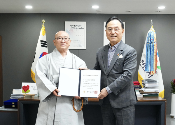 박상돈 천안시장은 4일 시장실에서 국가유산 소유자인 천안 각원사 주지 대원스님에게 충남 문화유산자료 지정서를 직접 전달했다.