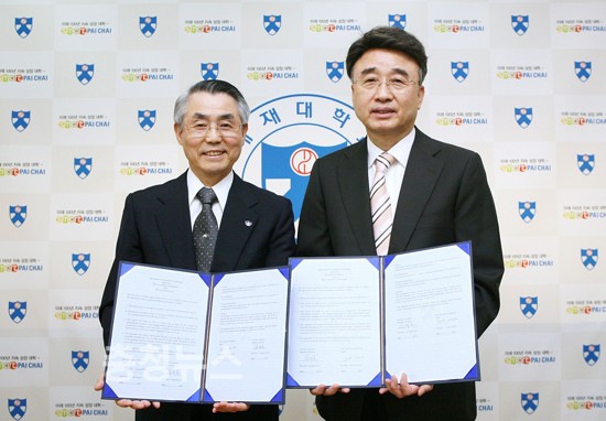 배재대학교와 일본 시마네현립대학은 26일 배재대 총장실에서 김영호 총장(오른쪽)과 혼다 유이치 총장(왼쪽)등 양 기관 관계자들이 참석한 가운데 학술 및 학생교류를 위한 협약을 체결했다.