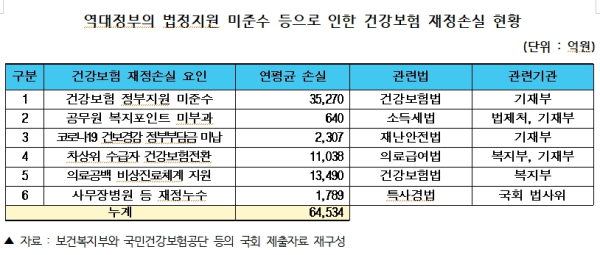 보고서는 건강보험 재정 손실 및 누수 금액이 연평균 6조 4,534억원에 달한다고 밝혔다. 이는 가족 해체를 막는 간병비 급여 확대나 전국민 치아 임플란트 건강보험 적용도 가능할 정도의 막대한 금액이다.