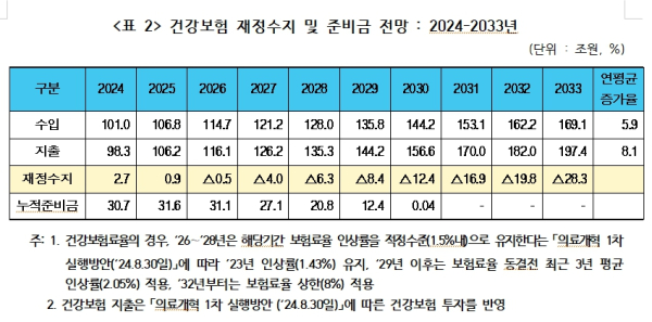 국회예산정책처 역시, 지역가입자 재산보험료 축소로 인한 수입 감소, 노인의료비 증가, 의대 정원 확대 정책 관련 의료 공백 대응 비용, 필수의료 수가 인상 등 다양한 요인으로 인해 건강보험 재정의 당기수지 전환 시점과 누적 준비금 소진 시점이 예상보다 빠르게 다가올 수 있다고 경고했다.