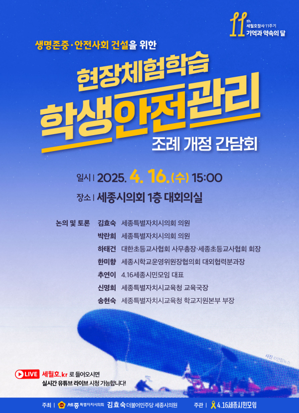 [충청뉴스 최형순 기자] 김효숙 세종시의원(더불어민주당)은 세월호참사 11주기를 맞아 16일 오후 3시, 세종시의회 1층 대회의실에서 '현장체험학습 학생안전관리지원조례' 개정을 위한 간담회를 개최한다.