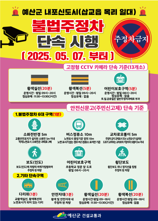 [충청뉴스 박영환 기자] 예산군은 내포신도시의 교통안전 확보와 보행자 중심의 안전한 도시 환경 조성을 위해 불법주정차 단속용 고정형 폐쇄회로를 오는 5월 7일부터 본격 운영한다고 밝혔다.