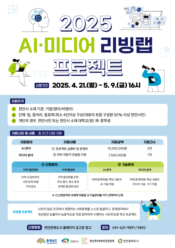 프로젝트에는 천안 시민을 비롯해 천안 소재 기관·기업과 단체·동아리(최소 4인 이상), 지역 대학(원) 재·휴학생 등이 참여할 수 있다.