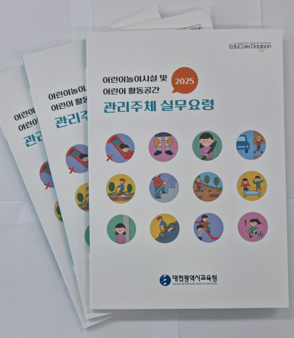 [[충청뉴스 이성현 기자] 대전시교육청은 25일 어린이놀이시설 및 어린이활동공간의 안전관리 역량을 강화하기 위한 관리주체 교육을 온라인으로 실시하고, 「어린이놀이시설 및 어린이활동공간 관리주체 실무요령」 책자를 제작하여 관내 공·사립 유치원(214개원), 초·특수·각종학교(151교)에 배부한다고 밝혔다.