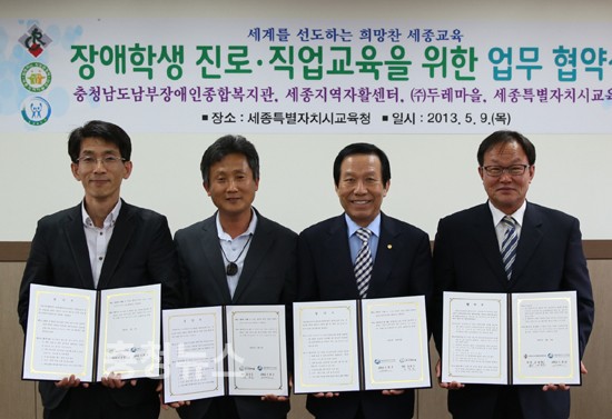 세종시교육청(신정균 교육감)은 9일 시교육청에서 장애학생들의 직업적 자립을 통한 성공적인 사회 진출을 위해 충남남부장애인종합복지관(관장 임대혁), 세종지역자활센터(센터장 윤성웅), ㈜두레마을(대표 김영도)과 업무협약을 맺고 장애학생의 진로와 직업교육을 강화한다.