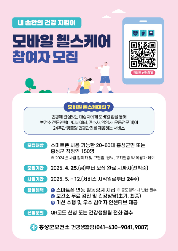[충청뉴스 박영환 기자] 홍성군보건소는 지역주민의 건강생활실천 유도 및 만성질환 예방을 위한 모바일헬스케어 사업 참여자를 추가 모집한다고 1일 밝혔다.