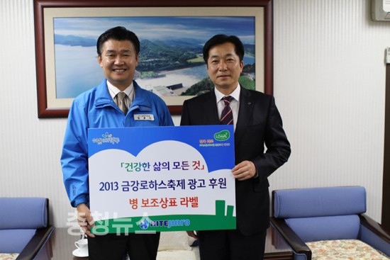 하이트진로(충청강원 영업본부장 이의성)는 25일부터 26일 까지 개최되는 금강로하스축제가 지역민과 함께 자연친화적이며 지역을 대표하는 명품축제로 자리매김할 수 있도록 하이트진로에서 생산하는 참이슬병 소주 100만병 보조상표라벨에 2013금강로하스축제를 광고 후원한다.