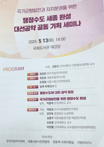 - 13일 국회 도서관 대강당에서 '행정수도 세종 완성' 주제로 세미나 개최
