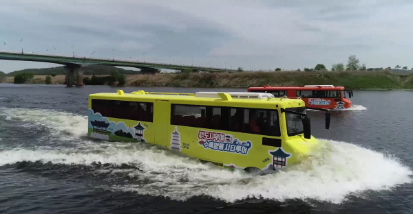 수륙양용버스는 육상과 수상을 모두 넘나드는 이색적인 버스다. 백제문화단지에서 출발해 천정대 주변 도로를 따라 달리다 백마강 레저파크에서 백마강 수상에 진입한다.