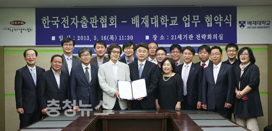 전자출판산업 활성화 위한 상호 정보교류 및 인력교류 약속 배재대학교와 한국전자출판협회는 대학 21세기관 회의실에서 김영호 총장(왼쪽 다섯 번째)과 이상운 회장(왼쪽 네 번째) 등 양 기관 관계자들이 참석한 가운데 전자출판산업 활성화를 위한 상호 정보교류 및 인력교류 등을 골자로 하는 업무협약을 체결했다. ▲ 배재대-한국전자출판협회 업무협약식 저작권자 © 충청뉴스 무단전재 및 재배포 금지 최온유 기자 다른기사 보기 기사가 마음에 드셨나요? 충청뉴스 좋은 기사 후원하기 1,000원 3,000원 5,000원 10,000원 30,000원 50,000원 직접입력 비회원 약관동의하기 ※ 소중한 후원금은 더 좋은 기사를 만드는데 쓰겠습니다.