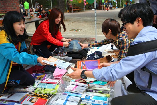 한남대 문과대 학생회가 20일 성년의 날을 기념해 교내에서 자선 바자회를 연 가운데 성년을 맞은 93년생 학생들이 헌옷과 책 등을 구입하며 불우이웃돕기에 동참하고 있다.