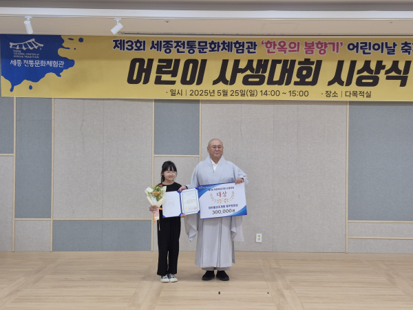 이날 시상식에는 사생대회 입상 어린이를 비롯한 학부모 등 70여 명이 참석했으며, 세종 전통문화체험관 현우 관장스님이 직접 시상을 진행하며 수상자들을 격려했다.