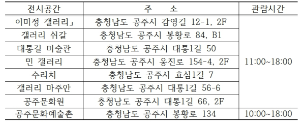 오는 8일(일)까지 진행되는 공주 왕도심 전시 투어 ‘2025 공주갤러리주간’은 「이미정 갤러리」, 「갤러리 쉬갈」, 「대통길 미술관」, 「민 갤러리」, 「수리치」, 「갤러리 마주안」, 「공주문화원」, 「공주문화예술촌」 등 왕도심 8곳에서 진행하며 각각의 주소는 아래와 같다. 모든 갤러리를 돌며 관람 인증 도장 7개를 찍고 마지막 도장은 공주문화예술촌 찍으면 소정의 기념품도 제공하고 있다.