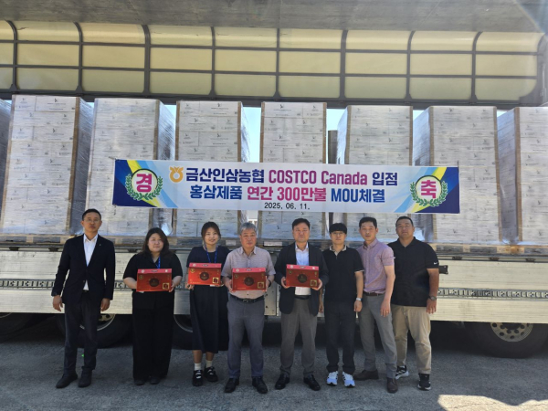지난 11일 부여군 은산면 소재 금산인삼농협 가공공장에서 인삼가공제품 3,600세트의 캐나다 코스트코 두 번째 수출을 축하하는 출고식이 열렸다. 이날 관계자들과 농가 대표 20여 명이 참석해 K-건강식품의 수출 활로 개척을 축하했다.
