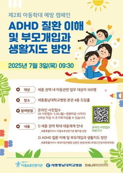 이번 교육에서는 황미영 세종시아동보호전문기관장이 세종 권역 학대 대응체계에 대한 안내를 시작으로 세종 1호 지역새싹지킴이병원으로 지정된 연세나무정신건강의학과의원 김현진 원장이 강사로 나서 주의력결핍 과잉행동장애(ADHD) 질환 이해 및 부모개입과 생활지도 방안에 대해 깊이 있는 실무지침을 전달할 예정이다.