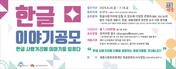 공모요강과 신청서는 세종시문화관광재단 누리집(www.sjcf.or.kr)에서 자세히 확인할 수 있으며, 기타 문의사항은 한글문화도시사업팀(044-850-8971)으로 연락하면 된다.