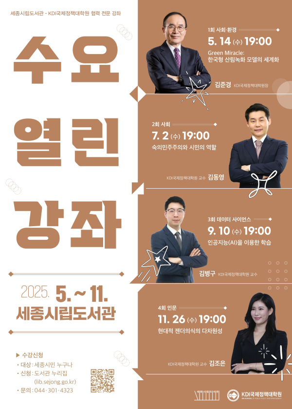 [충청뉴스 최형순 기자] 세종시립도서관이 오는 7월 2일 오후 7시 도서관 대강당에서 한국개발연구원(KDI) 국제정책대학원과 함께 ‘2025년 수요열린강좌’ 2회차 강연을 개최한다.