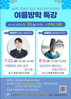 [충청뉴스 최형순 기자] 세종시교육청평생교육학습관은 6월 30일부터 ‘2025 여름방학 평생교육 아카데미 특강’ 수강생을 모집한다.