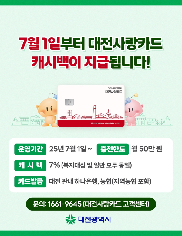 대전사랑카드는 월 구매한도를 기존 30만원보다 상향된 50만 원으로 책정됐다. 사용 금액의 7%를 캐시백으로 제공되며, 전액 사용 시 최대 3만 5,000원의 혜택을 받을 수 있게 된다.