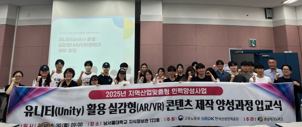 [충청뉴스 유규상 기자] (재)충남테크노파크(이하 충남TP, 원장 서규석)는 지난 30일 남서울대학교 지식정보관 122호에서 ‘2025년 지역·산업 맞춤형 인력양성사업 유니티(Unity) 활용 실감형(AR/VR) 콘텐츠 제작 양성과정’ 입교식을 개최했다