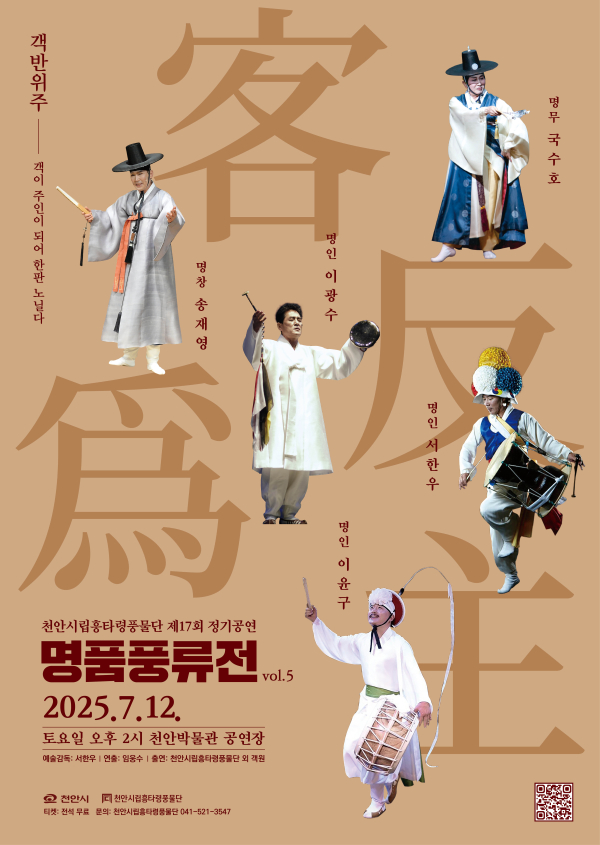 [충청뉴스 유규상 기자] 천안시립흥타령풍물단이 오는 12일 천안박물관에서 제17회 정기공연 ‘객반위주(客反爲主) 명품풍류전’을 연다.