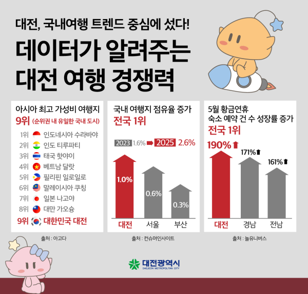 최근 발표된 다양한 관광 데이터에서도 대전은 강세를 보이고 있다. 여행 전문 리서치기관 컨슈머인사이트는 2023년 대비 올해 대전의 여행객 비중이 1.0%p 증가해 전국 최고 상승률을 기록했다고 밝혔다.