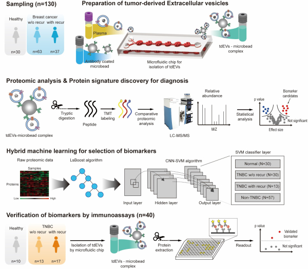 연구팀은 기존 진단 방식의 한계를 극복하고자 독자적인 미세유체 칩 기반 엑소좀 분리 기술을 개발하고 머신러닝 기반 알고리즘을 활용해 진단 성능을 극대화했다. 그 결과 삼중음성유방암 환자군에서 민감도 90%, 특이도 95%에 달하는 높은 진단 성능을 확보했다.