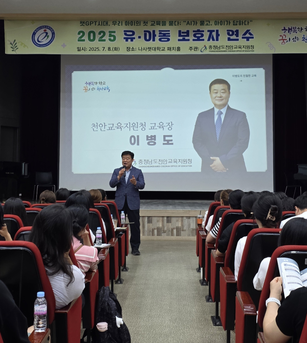 [충청뉴스 유규상 기자] 충청남도천안교육지원청(교육장 이병도)은 8일 유치원 및 초등 저학년 자녀를 둔 보호자 250여 명이 참석한 가운데 『챗GPT시대, 우리 아이의 첫 교육을 묻다』라는 주제로 보호자 연수를 개최했다.