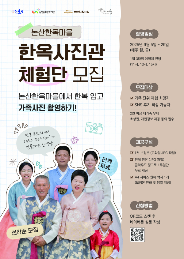 [충청뉴스 논산 = 조홍기 기자] 논산문화관광재단(이사장 백성현)이 운영하는 논산한옥마을에서 가족 단위 체험형 콘텐츠인 ‘한옥 사진관’ 프로그램이 오는 9월 운영을 앞두고 선착순 체험단 모집에 나선다.
