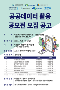 [충청뉴스 이성현 기자] 연구개발특구진흥재단이 AI·데이터 기반 지역문제 해결을 위한 ‘공공데이터 활용 문제해결형 공모전’을 오는 9월까지 대전권 산학협의체 대학(원)생을 대상으로 진행한다고 15일 밝혔다.