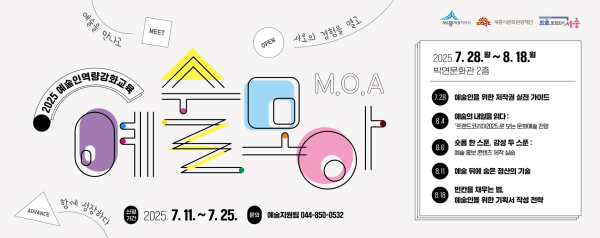 [충청뉴스 최형순 기자] 세종시문화관광재단(대표이사 박영국)은 지역 예술인들의 역량 강화를 위한 '2025 예술인역량강화교육 <예술, 모아(M.O.A)>' 참가자를 선착순으로 모집한다.