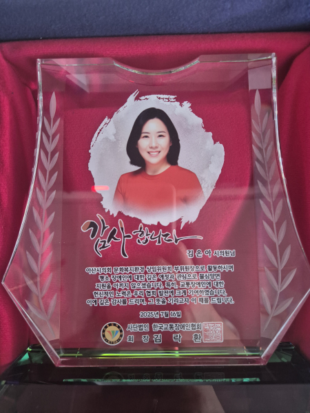 [충청뉴스 유규상 기자] 아산시의회 김은아 의원(국민의힘, 마선거구, 배방읍의 갈매리, 공수리, 구령리, 북수리, 세출리, 수철리, 신흥리, 중리, 회룡리 지역구)은 16일 한국교통장애인협회로부터 감사패를 수상했다.
