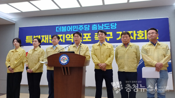 문진석 충남도당 위원장(천안갑)과 이재관 국회의원(천안을), 조한기 서산·태안지역 위원장, 충남도의회 민주당 원내대표 김선태(천안10) 의원, 안장헌(아산5)·오인환(논산2)·이지윤 의원(비례) 등은 18일 오후 충남도청 프레스센터에서 기자회견을 갖고 특별재난지역 선포를 호소했다.