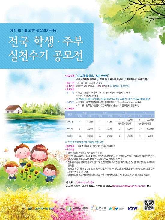 한국농어촌공사(사장 박재순)가 주최하고 농림축산식품부․교육부․환경부가 후원하는 '제15회 내 고향 물살리기운동 전국 학생·주부 실천수기' 공모가 1일부터 시작된다.