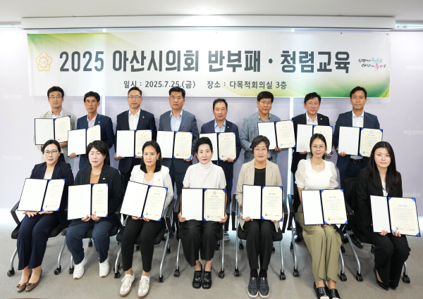 [충청뉴스 유규상 기자] 아산시의회(의장 홍성표)는 지난 25일 의회동 다목적회의실에서 전체 시의원 및 사무국 직원들을 대상으로 청렴하고 공정한 직무수행을 돕기 위한 ‘선출직 공직자 맞춤형 청렴교육’을 실시했다.