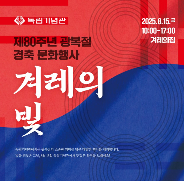 [충청뉴스 유규상 기자] 독립기념관(관장 김형석)은 제80주년 광복절을 맞아 다양한 이벤트 행사를 준비한다.
